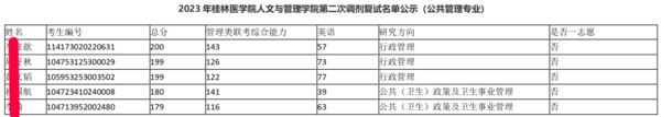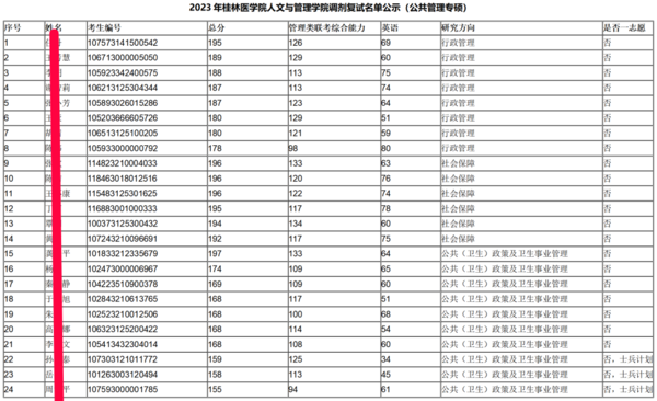 从2023考研桂医MPA一志愿上线及录取情况,可以看出:(1)学校分数要求较低,一志愿过线(165分)即可进入复试;(2)学校整体照顾一志愿,一志愿上线9人,录取8人,只有1人未被录取。 003 调剂情况 现在,再让我们来看看2023考研的调剂情况!众所周知,调剂的竞争都比较大,那么桂林医学院的情况如何? 1、调剂复试名单