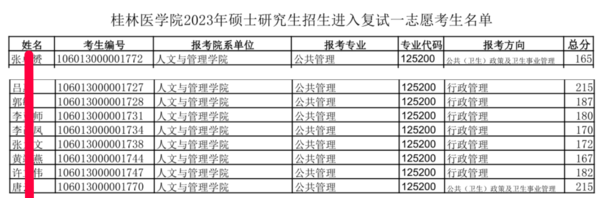 报考条件:报考公共管理学位(专业型 125200)硕士研究生考生,必须是大学本科毕业有3 年以上工作经验的人员,或已获硕士学位或博士学位并有 2 年以上工作经验的人员。 公共(卫生)政策及卫生事业管理方向(02)只允许在医药卫生系统工作,本科专业为医学门类和管理学类(含行政管理、信息管理与信息系统、市场营销、公共事业管理、健康服务与管理和养老服务管理等)的学生报考。 002 上线情况 接下来,让我们看看2023考研桂林医学院公共管理(MPA)2023考研一志愿上线及复试情况! 1、一志愿复试名单