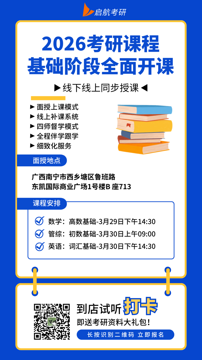 发表时间:2025-03-28 17:38 广西考研资讯,尽收其中! ![]() 考研公共课|考研专业课|考研集训营|考研1对1 硕博初试辅导|复试培训|调剂指导|留学服务 用专业、专注的视角,为大家解决更多考研路上的难题! 广西启航,懂广西考研,更懂你!在这个浮躁的时代,我们坚持深耕考研行业,为考研学子提供有价值的信息和服务。 关注我们,在混杂斑驳的信息世界中,找到方向、独立思考,与优质内容砥砺同行。 广西启航考研,十年坚持,只为送你上岸! ![]() 报班送周董演唱会门票啦!!! 即日起,凡在广西考研(西大校区)成功报名全科课程的同学,将赠送一张周杰伦演唱会南宁站的门票! 三月三,要唱山歌,也要认真学习 本周末26考研课程继续 欢迎大家预约试听 ![]() 码字不易,喜欢可以点赞♥、关注、收藏! 考研竞争如此激烈,考研人如何提高效率、脱颖而出? 广西2024考研寄宿集训营,火热招生中! ↓ ↓ ↓ ![]() |