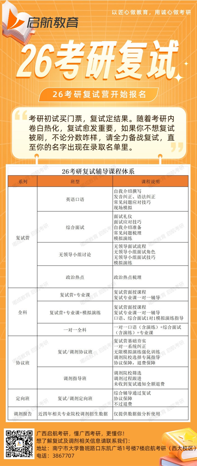 发表时间:2025-12-21 15:13 2026考研数学二初试真题_考研真题参考答案_试卷真题及答案解析 [广西启航,懂广西考研,更懂你!] 2026考研初试12月20—21日进行,经历了一年多的辛苦备考,对于大多数的同学来说,都非常不容易!考研结束第一件事情做什么?当然是先估分!提前了解自己的分数,有利于我们进行后续的复试以及调剂工作! 为了方便同学们进行估分,广西嘟成教育启航考研考研整理了“2026考研真题及参考答案汇总”,供同学们进行参考!各个考试科目,我们会及时进行动态更新!希望大家早点估分,提前做好复试的准备!此外,我们广西嘟成启航2026考研的复试培训班,已经全面启动招生!欢迎咨询了解!更多广西地区考试信息,关注“广西启航考研培训”公众号! 想要获取“完整真题电子版”, 微信请备注“2026真题”! 2026年全国硕士研究生招生考试数学二试题及答案 想要获取“完整真题电子版”, 微信请备注“2026真题”! 扫码加入26考研初试答案解析群,一站获取考研各科目真题及答案! ↓ ↓ ↓